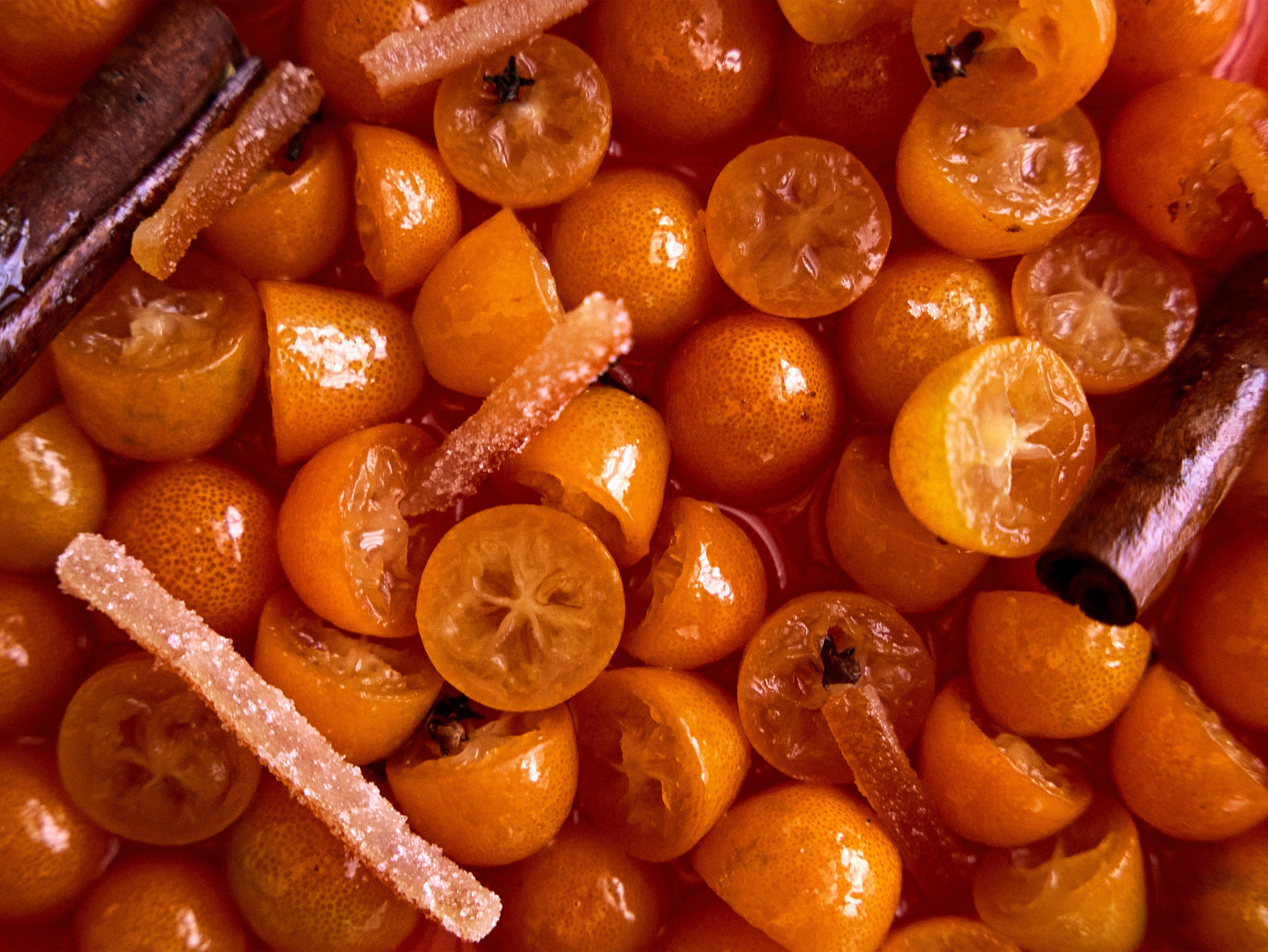 kumqat, oranges, sucre de betterave, épices : cannelle, cardamome, clou de girofle, badiane