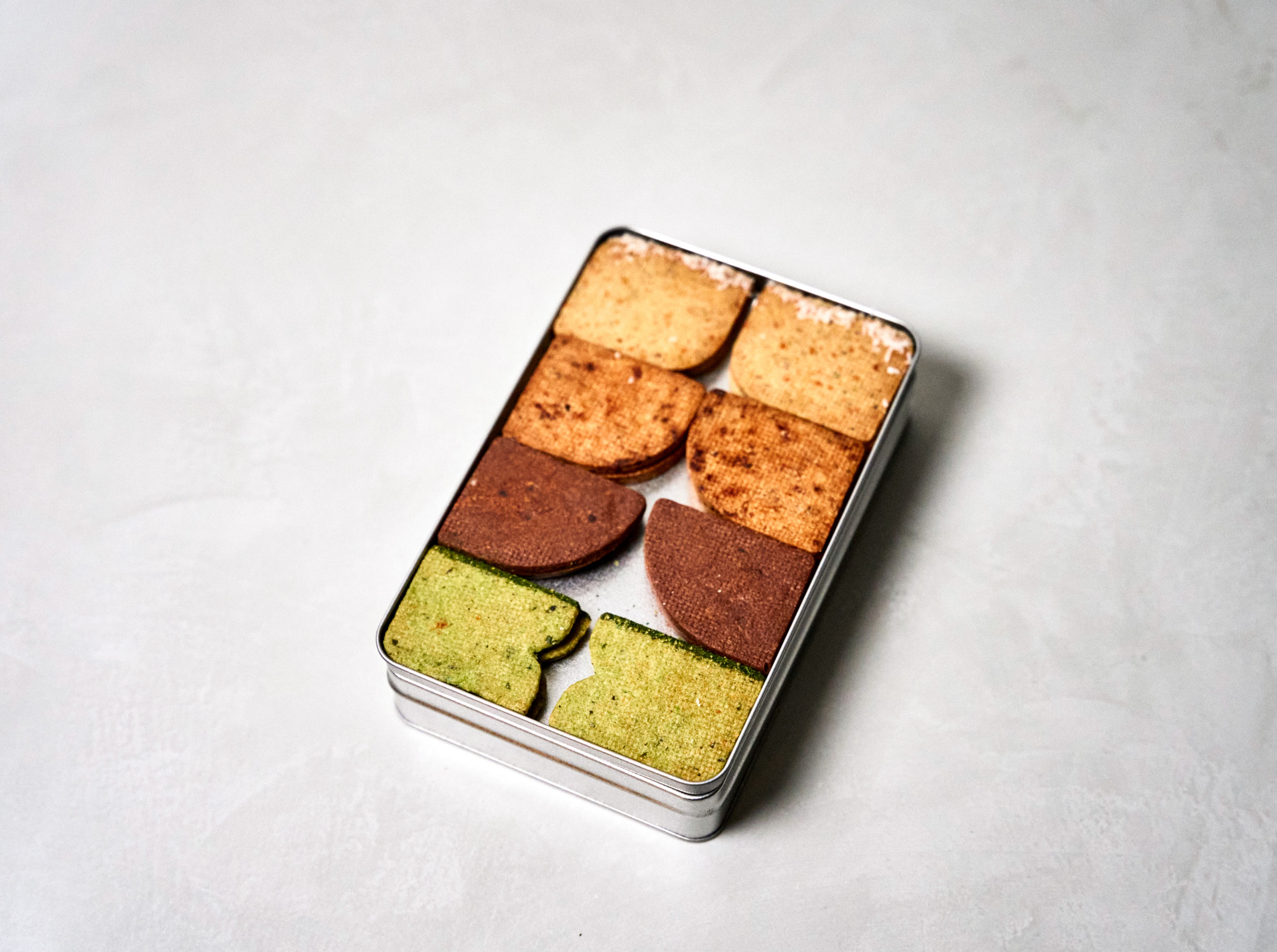 Dans cette boîte en métal, des sablés graphiques s’alignent comme de petites pièces de design : formes franches, couleurs contrastées, textures qui attirent l’œil avant même la première bouchée.